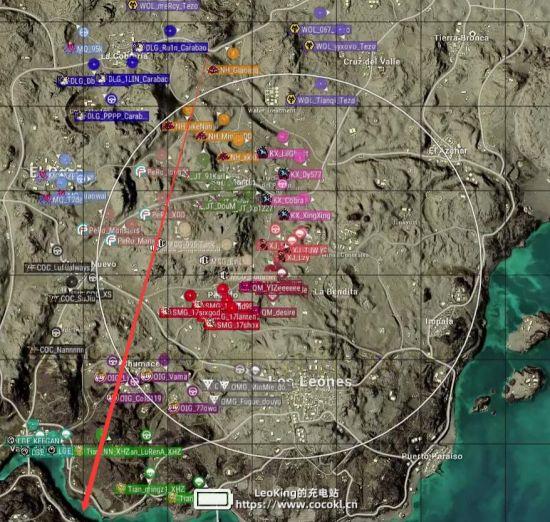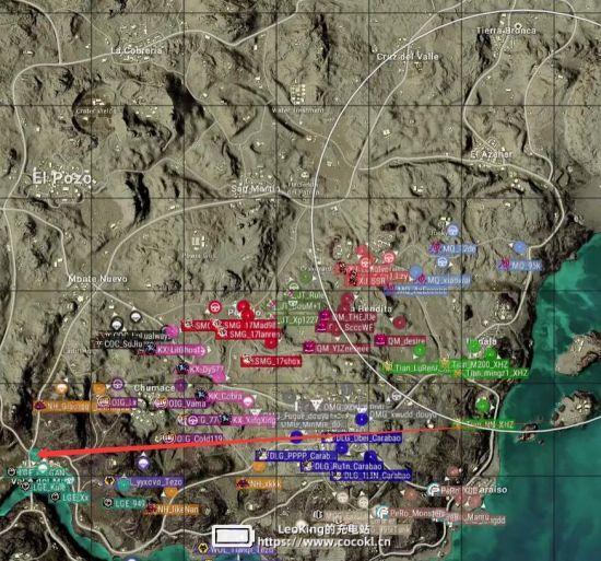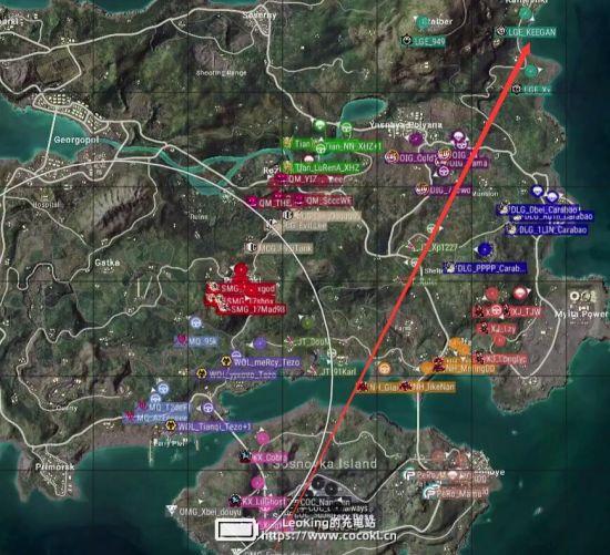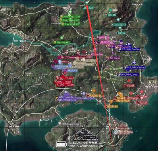 本局比赛采用海岛图,飞机从下往上,从N港飞往S城右侧,航线略偏右。COC去往机场,PERO去往N港,KX去往Y城,安全区刷在了地图左下方,非常极端。
