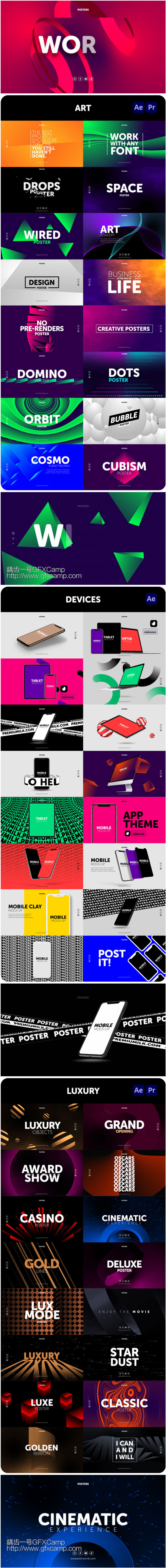 包含栏目包装、时尚排版、情人节、奢华文字、信息数据(只支持AE)、移动设备(只支持AE)等多种效果预设,脚本形式,使用简单,所有的图片、文字、颜色等多种参数都可以修改