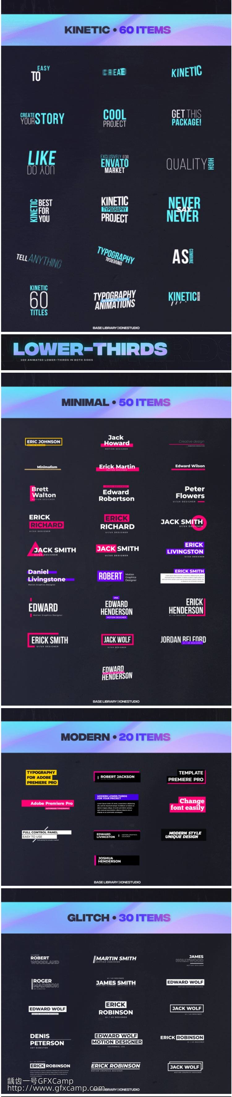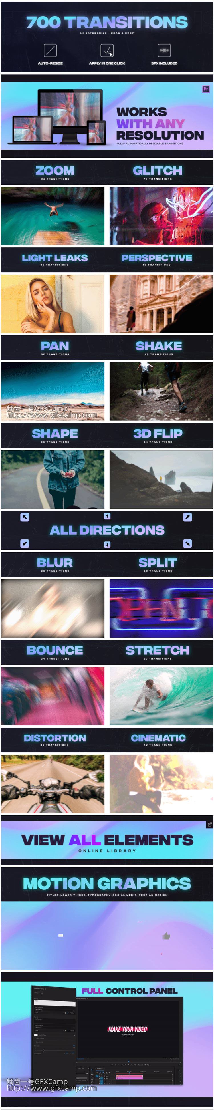 - PR版本包含700个视频无缝转场+800个文字标题字幕条动画+200组视频调色+300组视频特效预设+100组视频分屏(分屏预设需要2021)+420个音效,字幕条的文字、字体、颜色等都可以修改