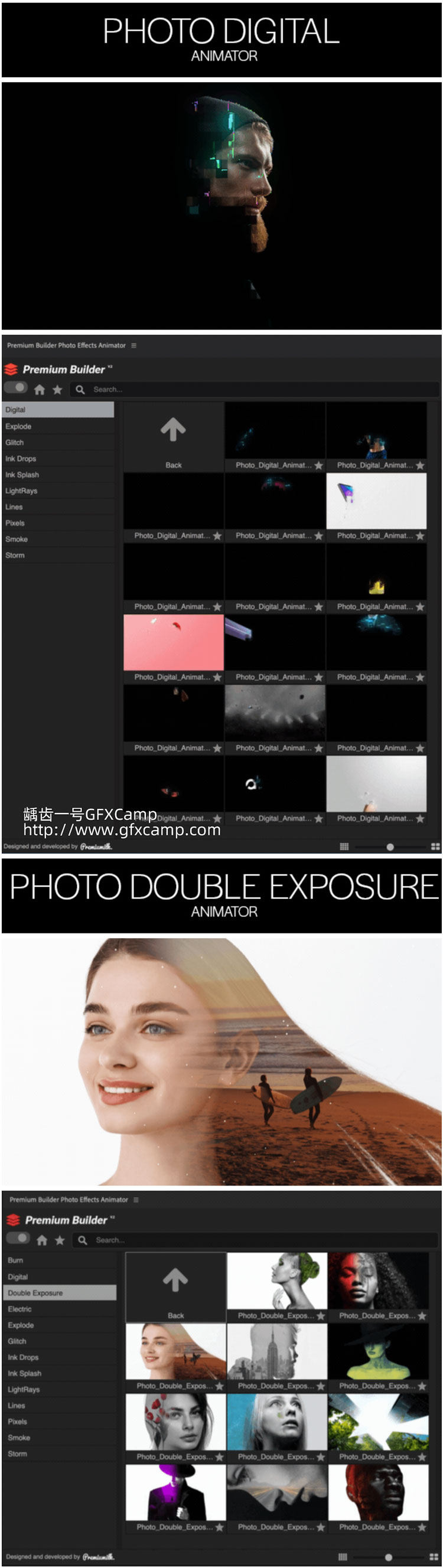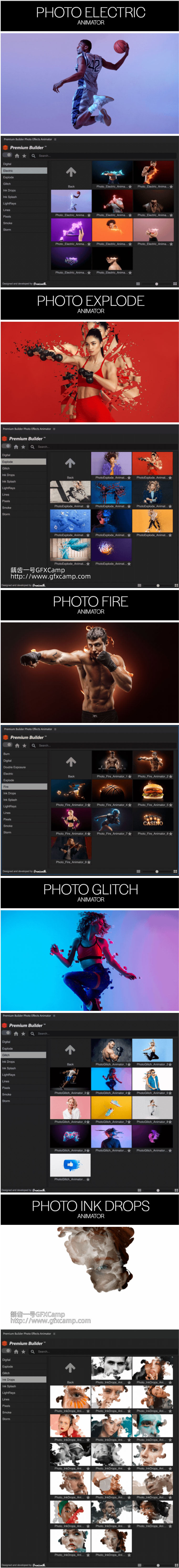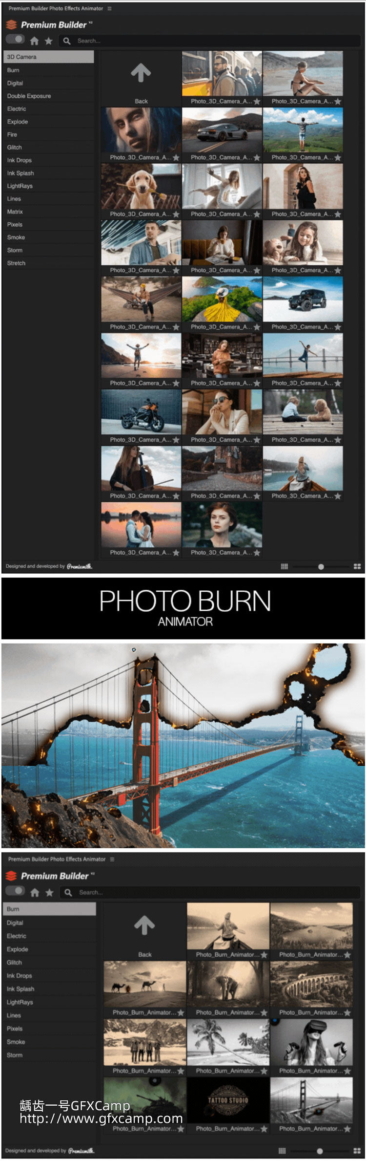 包含图片转三维、燃烧遮罩转场、科技感、多重曝光、电流、边缘破碎、火焰、粒子飘散、信号损坏、水墨遮罩、丁达尔光效、线条描边、烟雾飘散、像素拉伸等多种效果,这些效果只能用在图片上,不能用在视频文件上