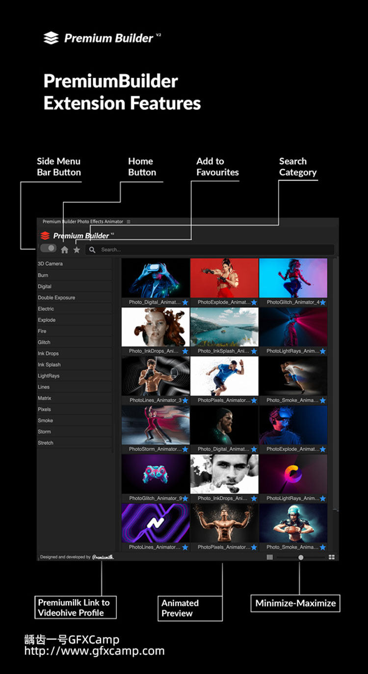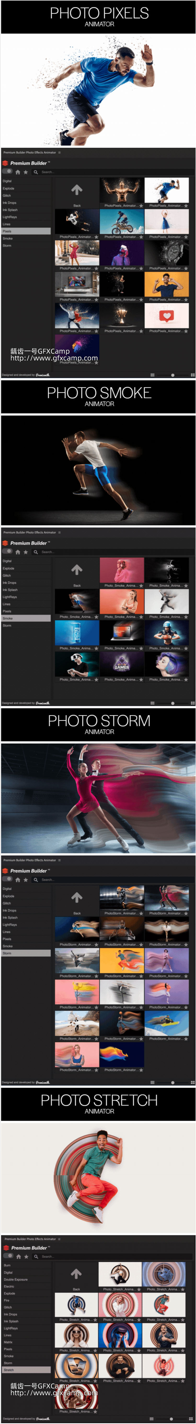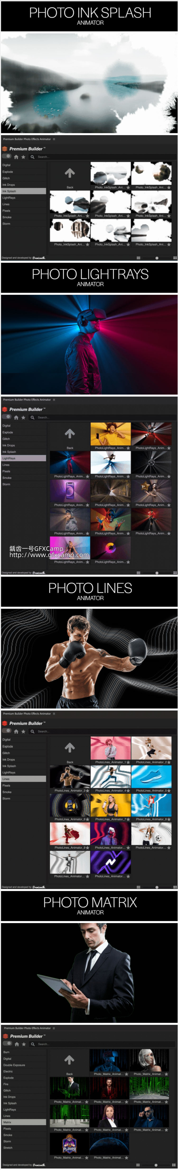 包含图片转三维、燃烧遮罩转场、科技感、多重曝光、电流、边缘破碎、火焰、粒子飘散、信号损坏、水墨遮罩、丁达尔光效、线条描边、烟雾飘散、像素拉伸等多种效果,这些效果只能用在图片上,不能用在视频文件上